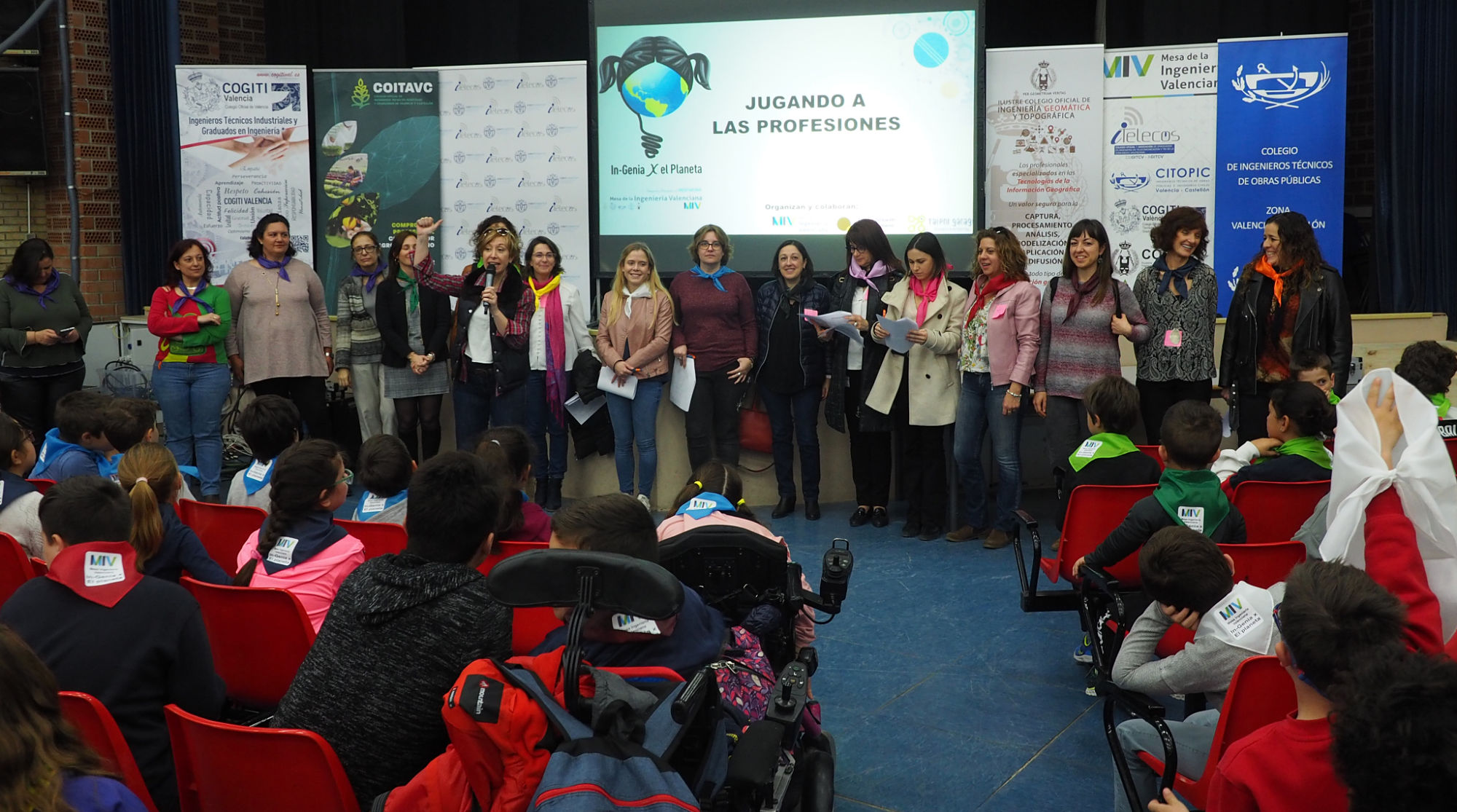 La jornada empezaba a las diez de la mañana: 140 alumnos de cuarto y quinto de primaria se han dado cita en el salón de actos del Comenius para aprender, de forma divertida, qué es la ingeniería y qué hacen los ingenieros. Así, cinco mujeres ingenieras han representado a otros tantos colegios profesionales técnicos, miembros de la Mesa de la Ingeniería de Valencia: COGITI (Ingeniería Técnica Industrial), COITACV (ingeniería agrícola), CITOPIC (obras públicas), COGITCV (telecomunicaciones) y COIGT (geomática y topografía).