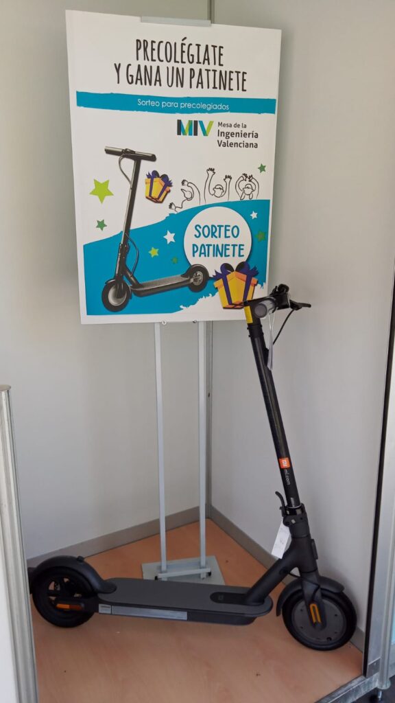 Los cinco colegios que integran la Mesa de Ingeniería Valenciana estaremos presentes en la zona de exposición con un stand informativo en el que sortearemos un patinete entre todos aquellos que se acerquen a precolgiarse.